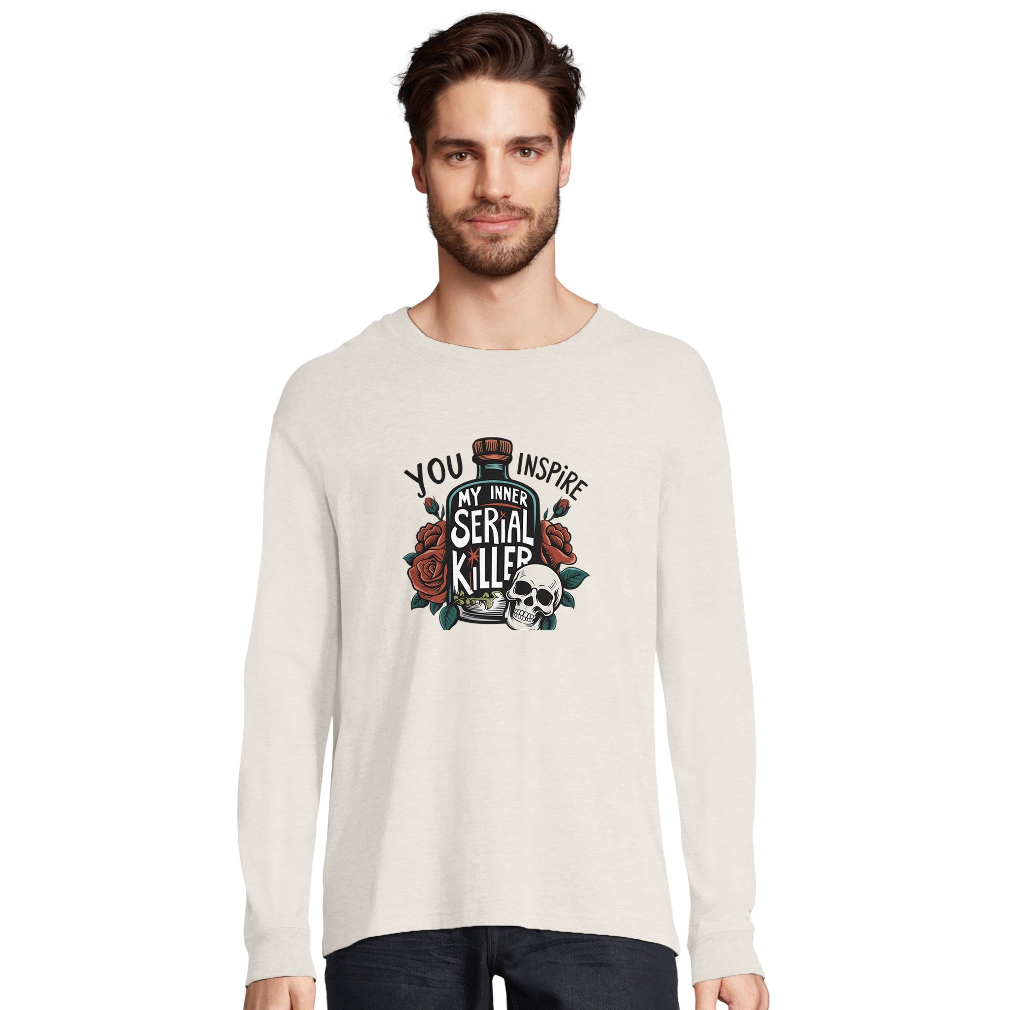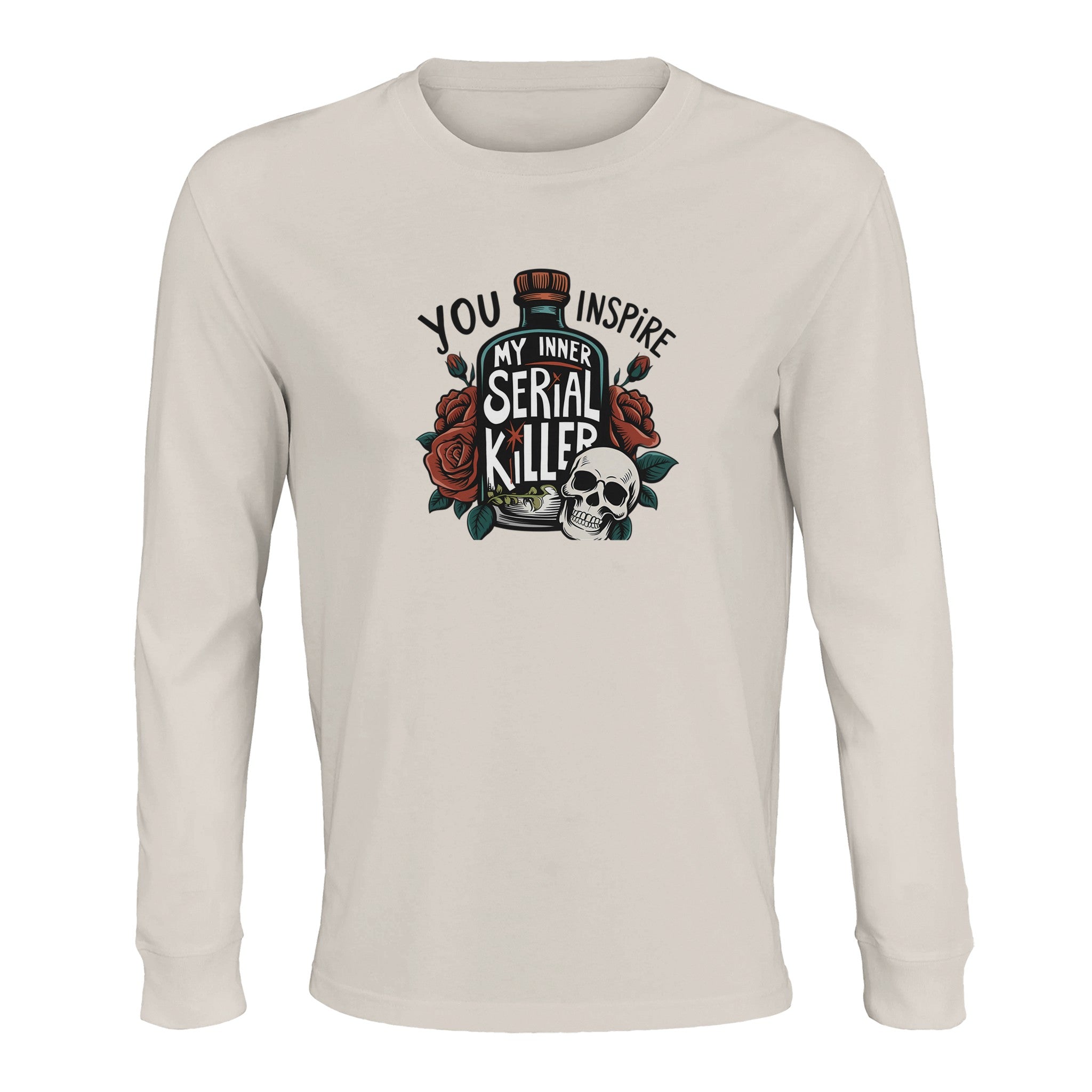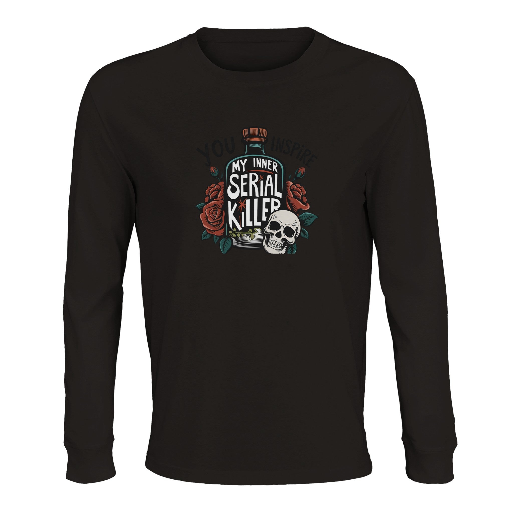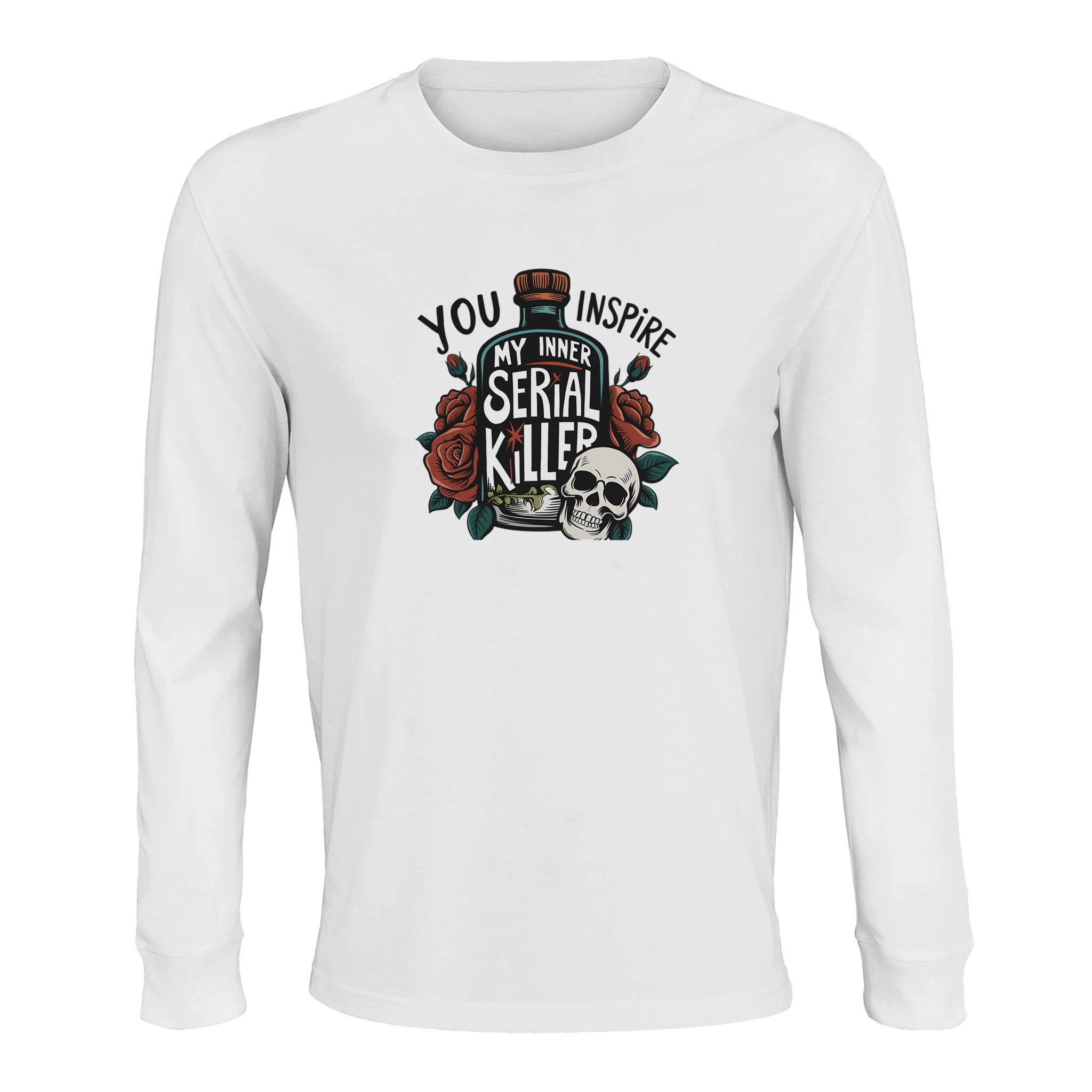 Unleash your dark humor with our 'Inspire My Inner Serial Killer' Unisex Long Sleeve Tee. This bold design, featuring a skull, a bottle, and a blooming rose, merges vintage tattoo artistry with a modern, edgy statement. Crafted for those who appreciate unique style and a touch of the macabre, this tee is sure to turn heads and spark conversations. Perfect for making a statement, or simply adding a distinct edge to your everyday wear, it embodies individuality and a rebellious spirit.