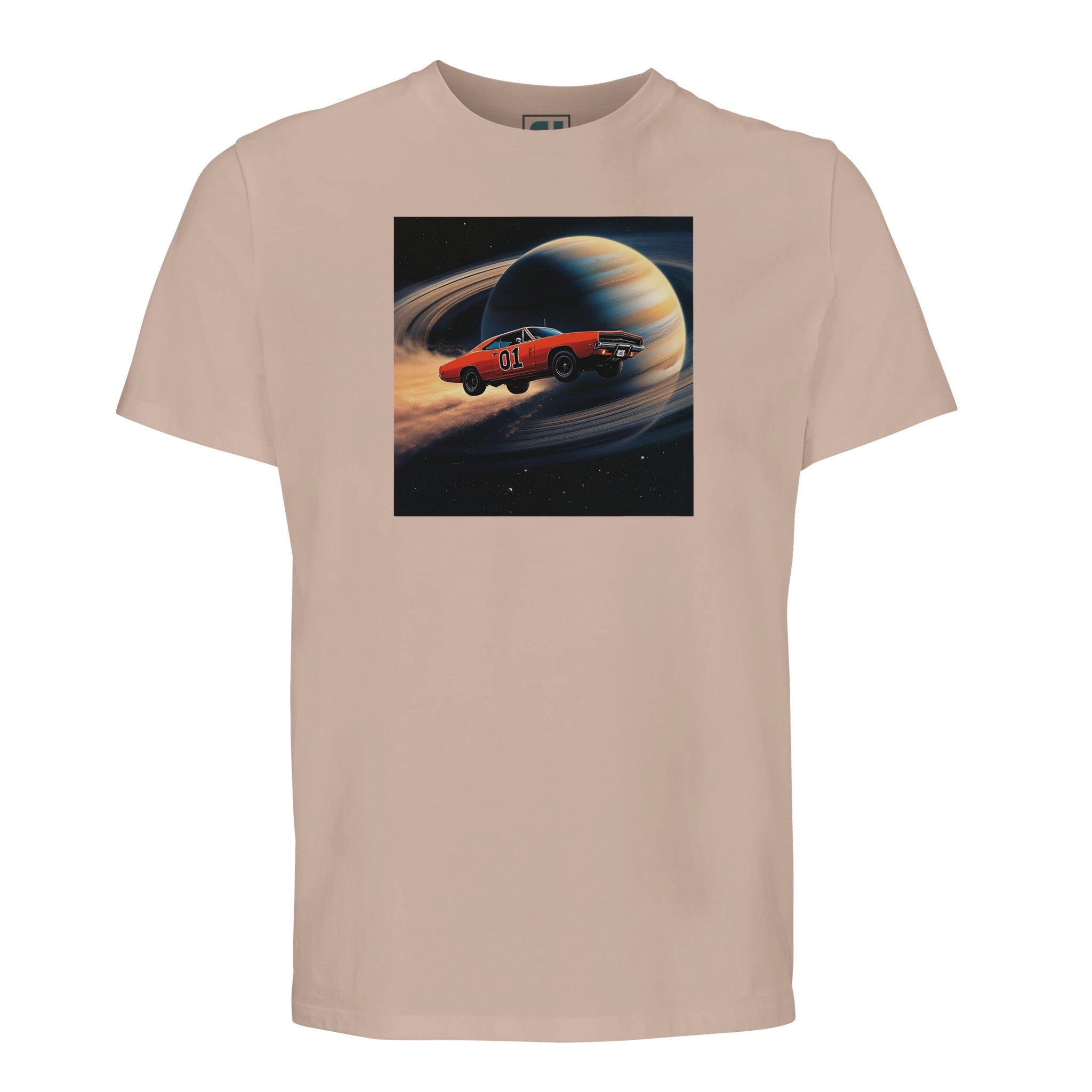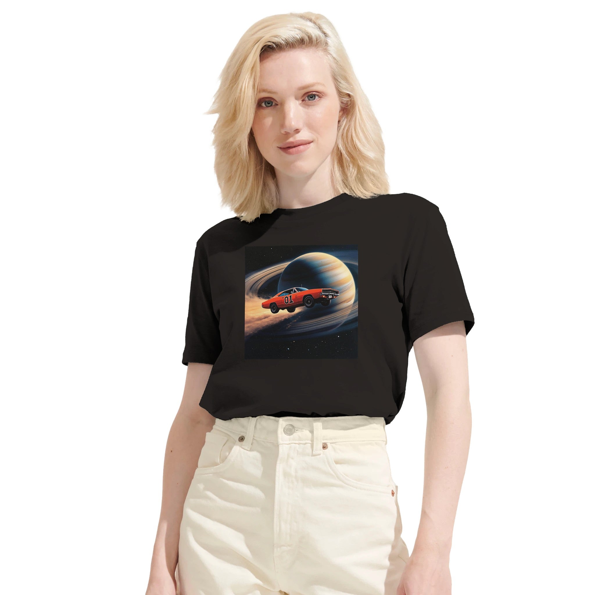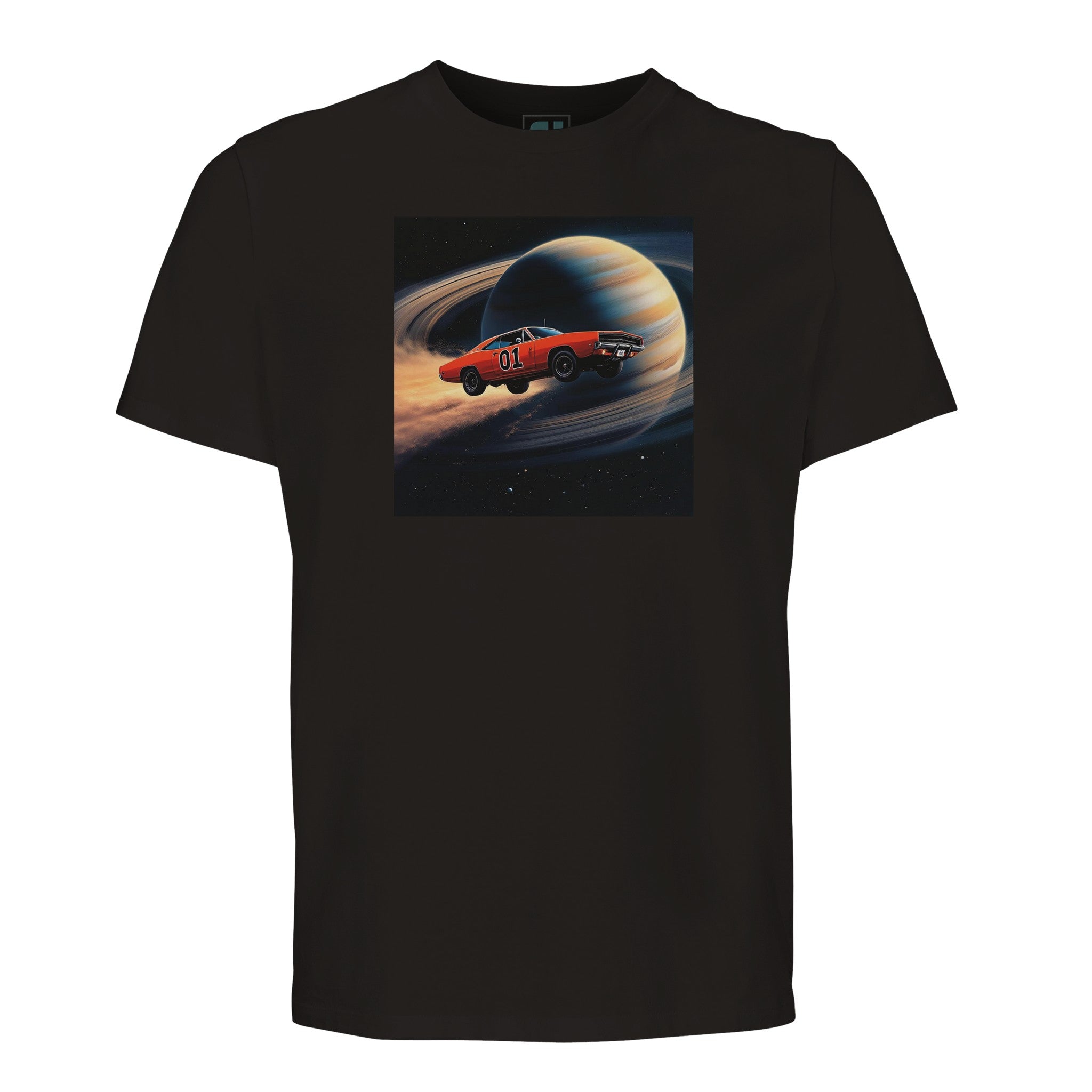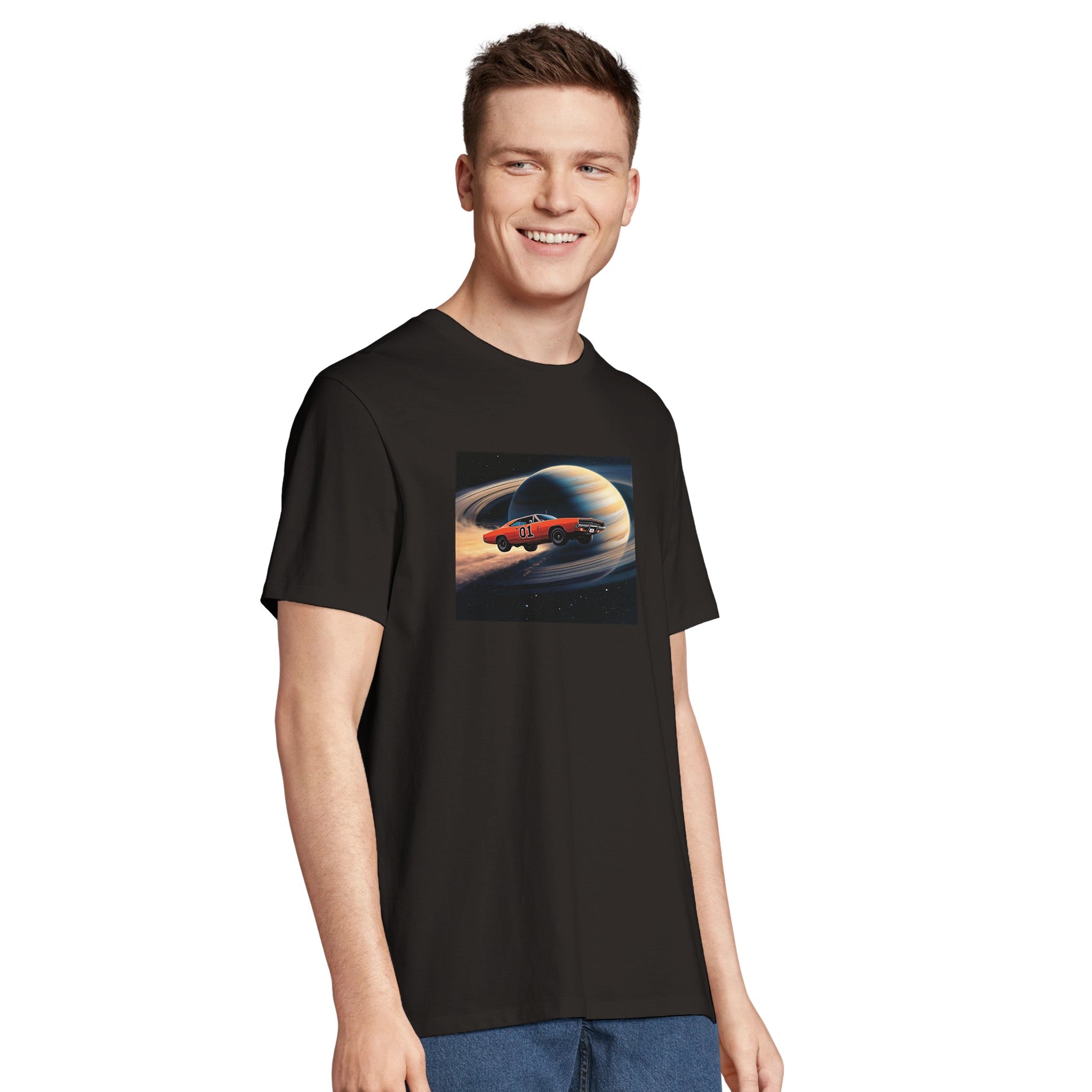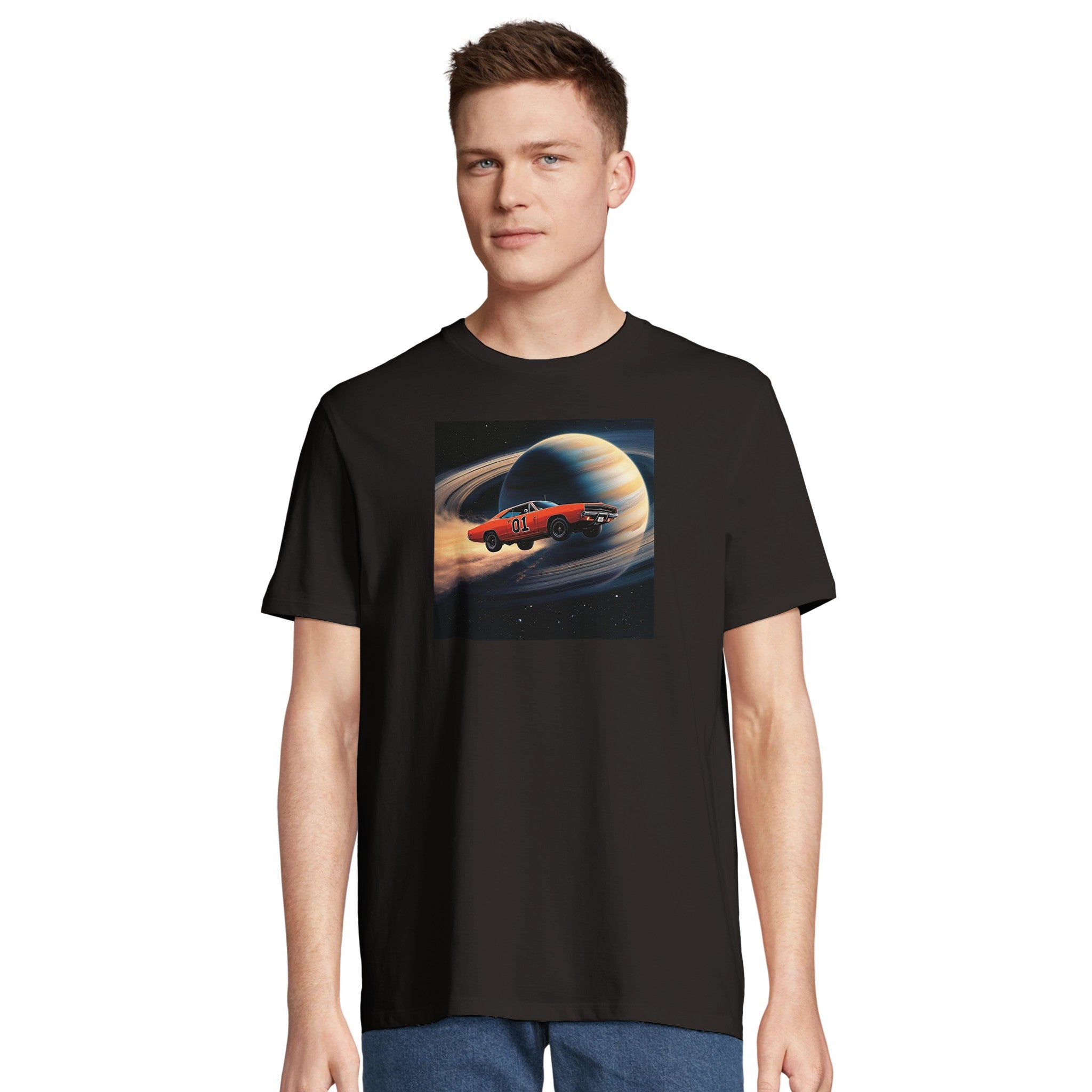 Unleash your inner space cowboy with our Cosmic Muscle Car Unisex Tee! This eye-catching design features a classic orange muscle car seemingly defying gravity, cruising through a vibrant galaxy with a ringed planet as its majestic backdrop. It's an instant conversation starter that combines vintage cool with an out-of-this-world adventure. Perfect for those who dream of interstellar road trips and appreciate unique, art-inspired fashion.