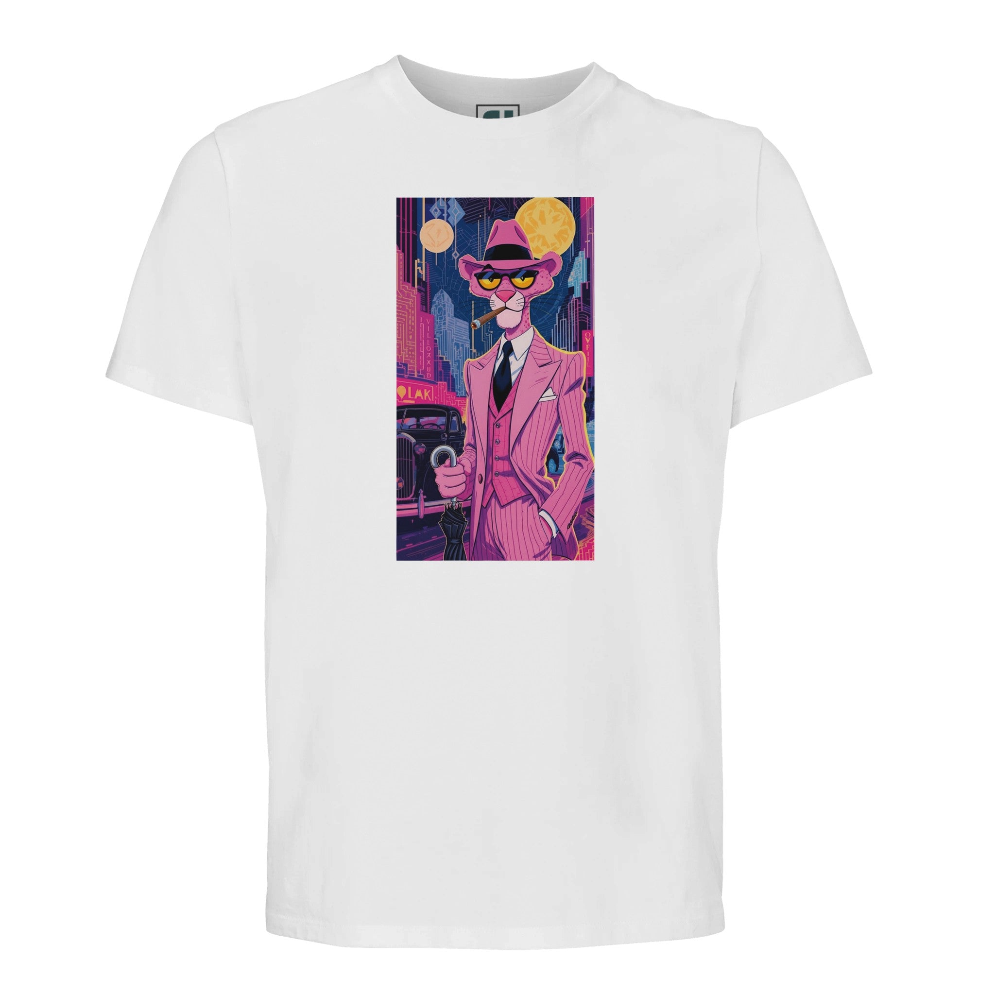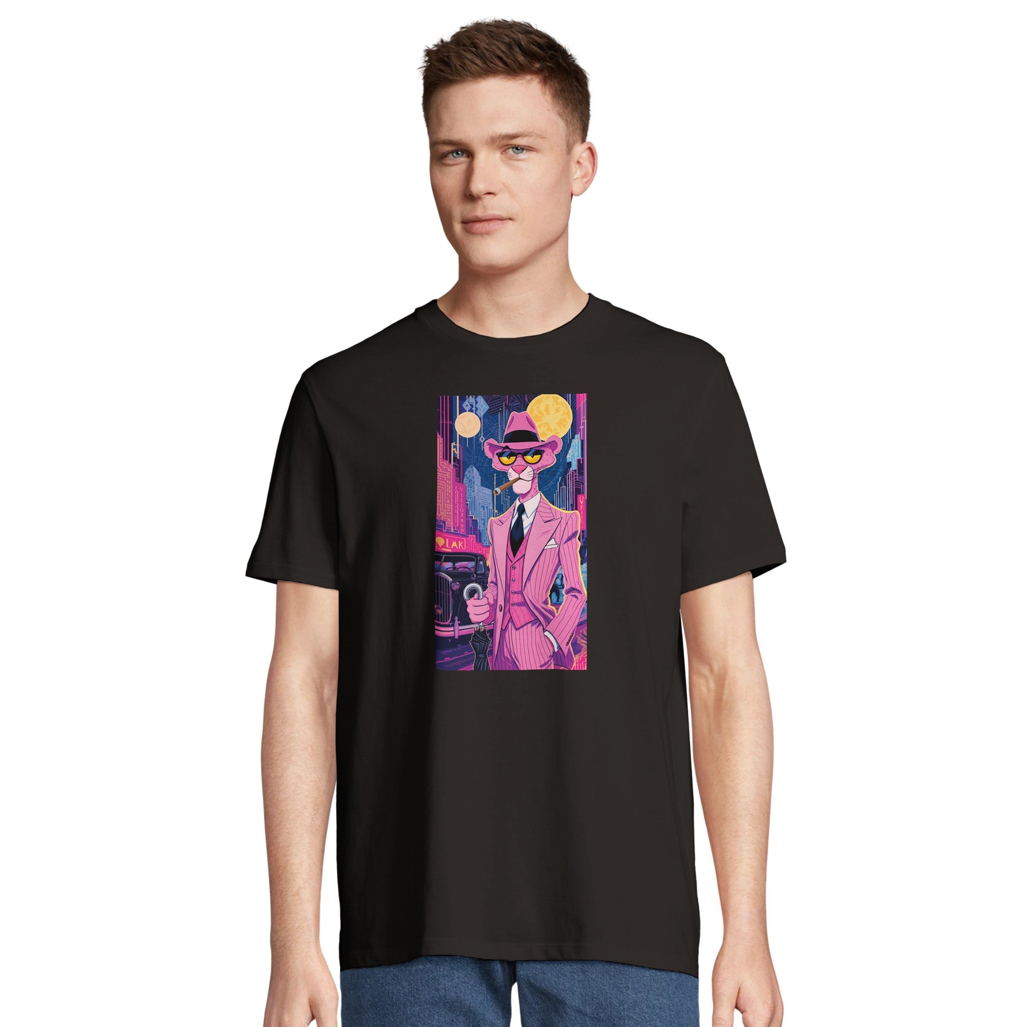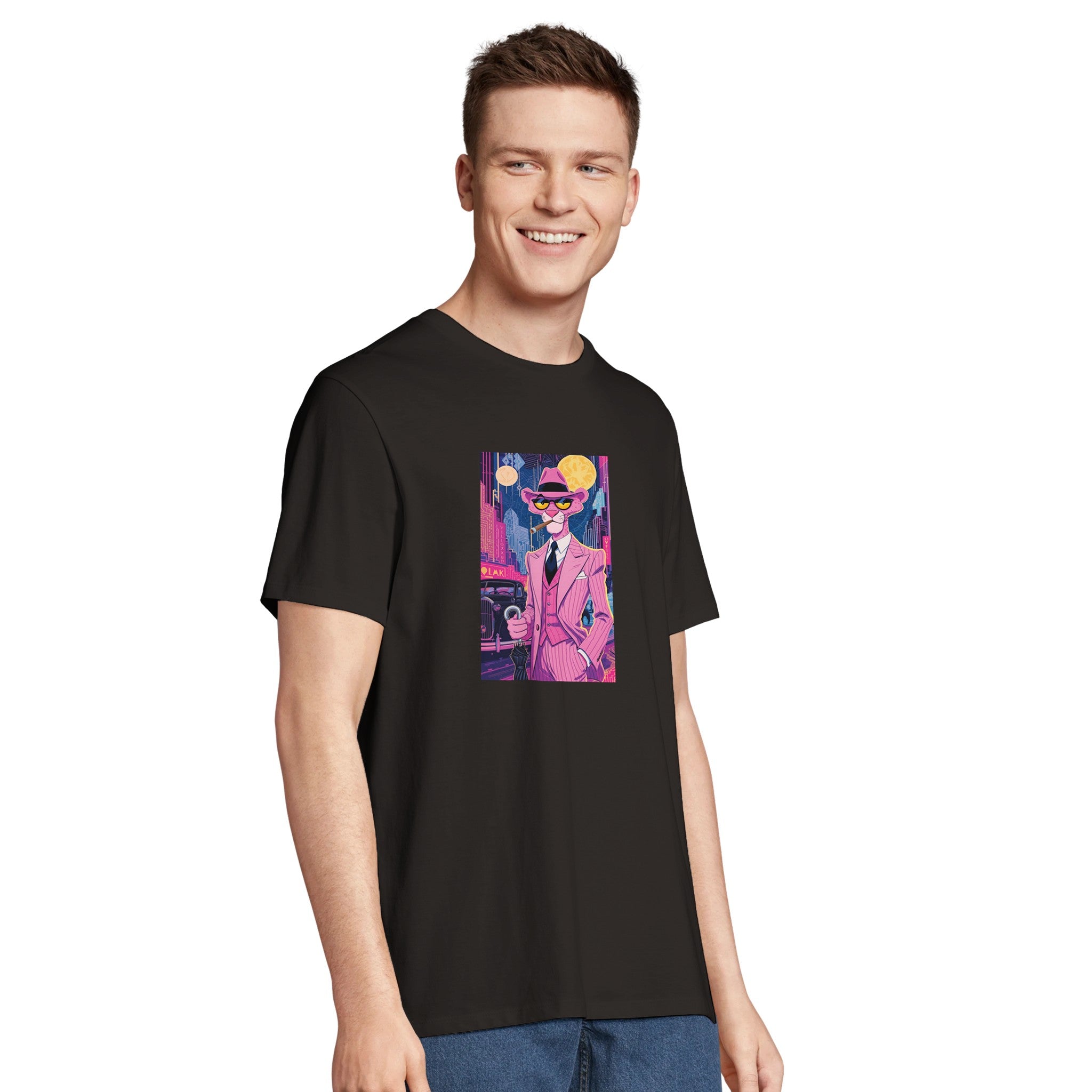 Unleash your inner debonair with our Pink Panther Noir T-Shirt, a tribute to classic cool meets vibrant city nights. Featuring the iconic Pink Panther in a sharp, pinstriped suit against a dazzling neon cityscape, this tee captures a mood of playful sophistication and mystery. It’s more than just a shirt; it’s a statement piece that brings an art deco, film-noir vibe to your everyday, all while championing sustainability.