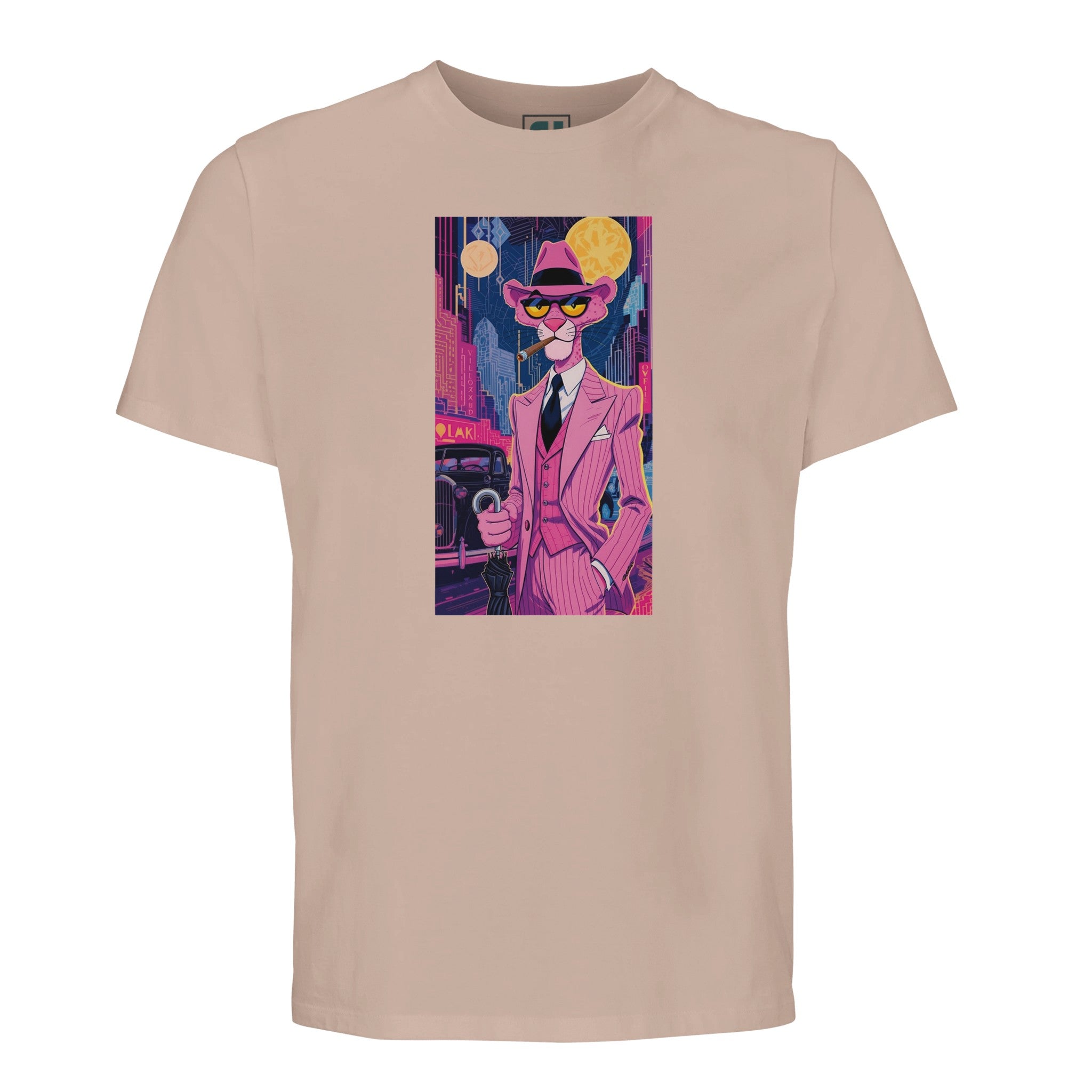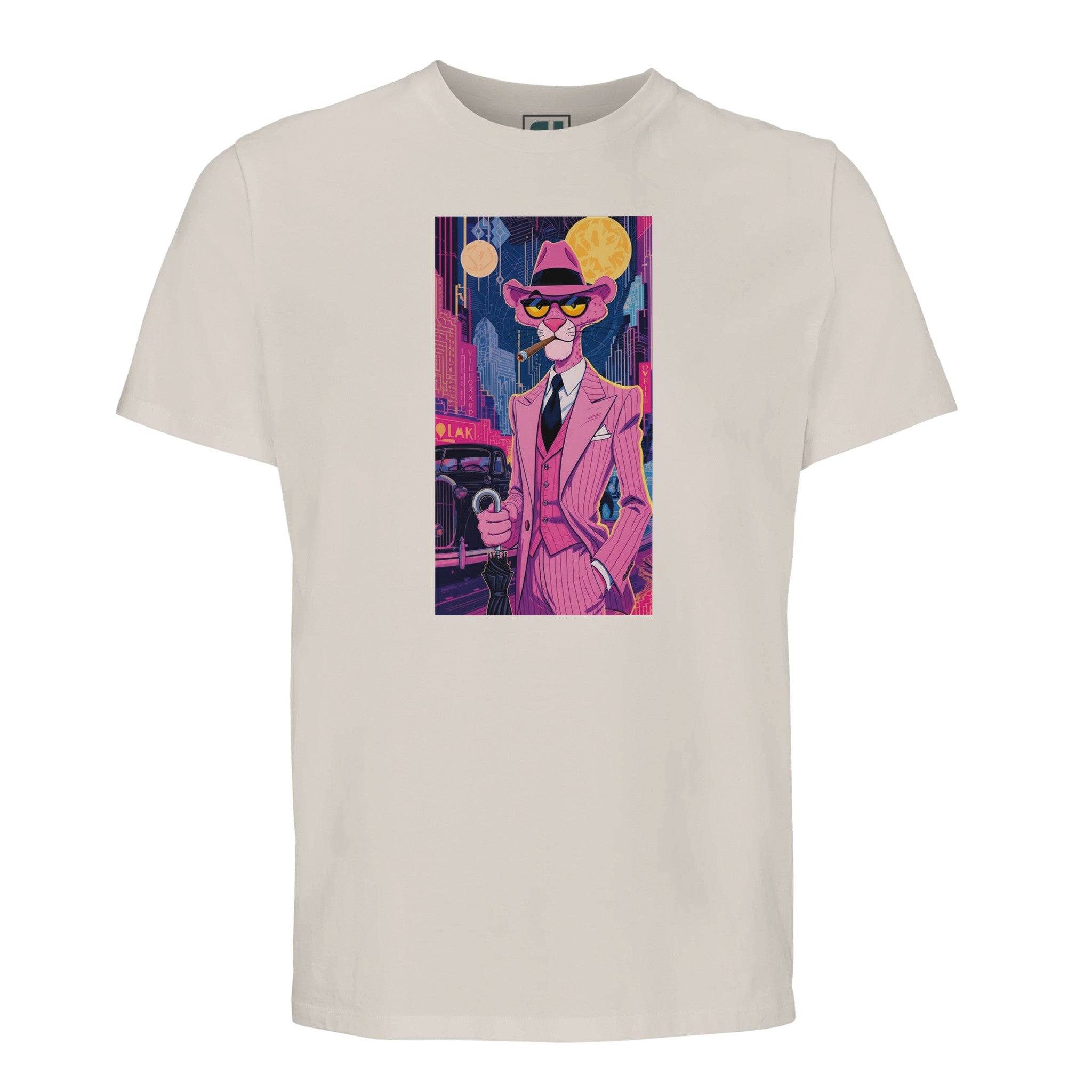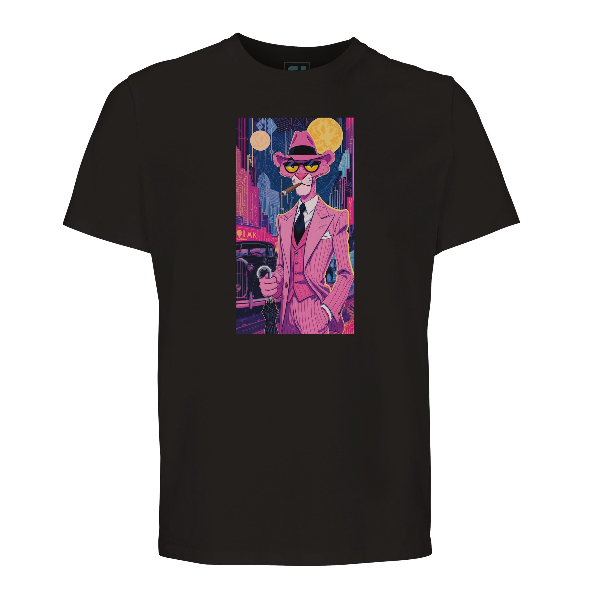 Unleash your inner debonair with our Pink Panther Noir T-Shirt, a tribute to classic cool meets vibrant city nights. Featuring the iconic Pink Panther in a sharp, pinstriped suit against a dazzling neon cityscape, this tee captures a mood of playful sophistication and mystery. It’s more than just a shirt; it’s a statement piece that brings an art deco, film-noir vibe to your everyday, all while championing sustainability.
